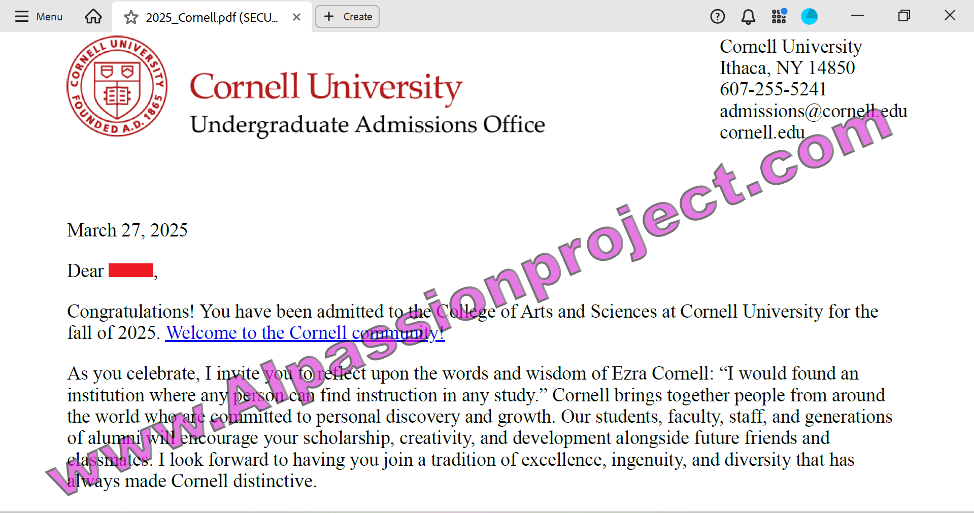 A CurioCat student has been accepted to Cornell University! This prestigious Ivy League school, ranked 12th nationally per US News & World Report, is renowned for its engineering program, commitment to research, and gorgeous campus. Click below to see a copy of the acceptance email: